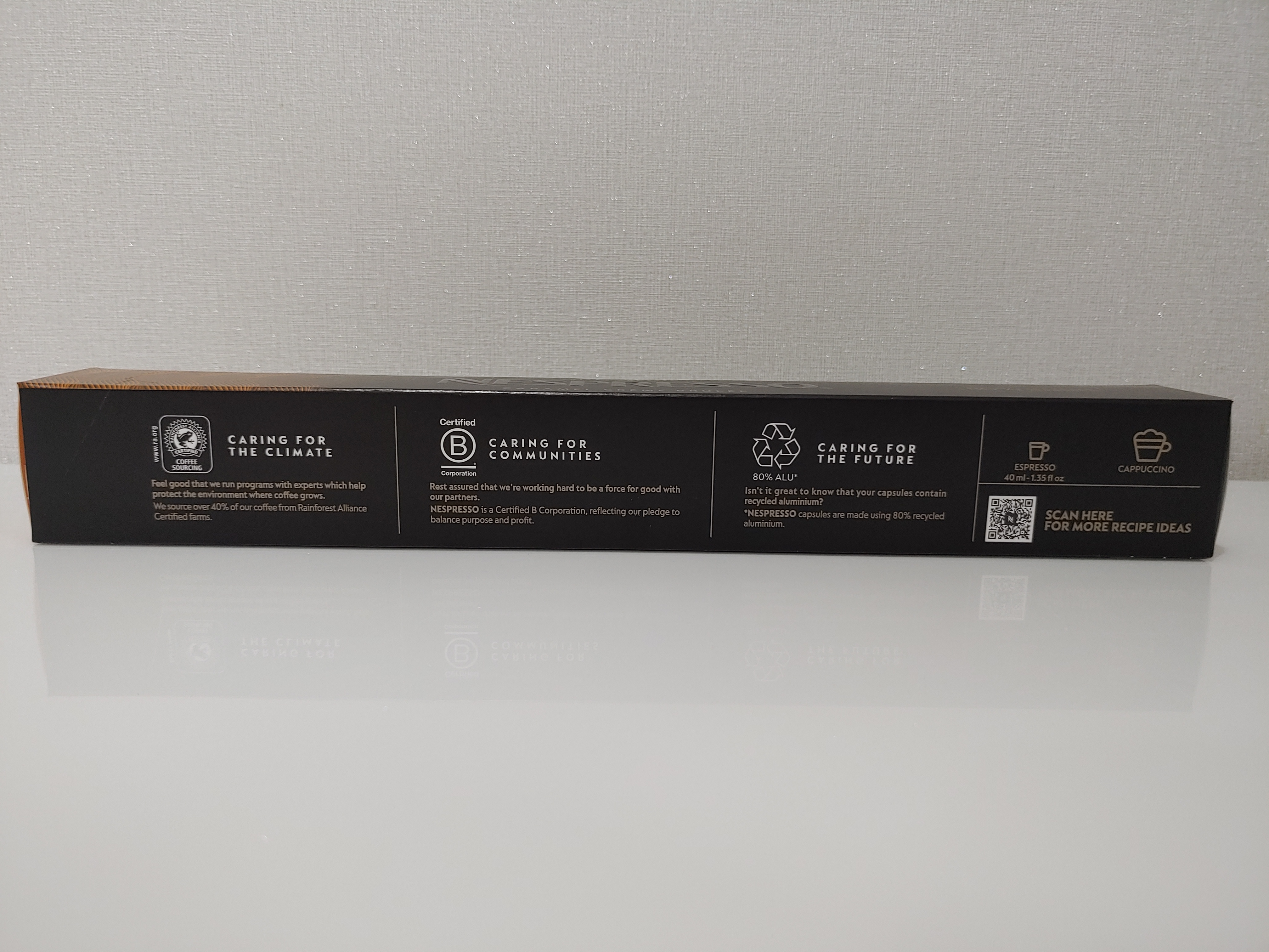 제품의 패키지에는 해당 제품의 인증내역과 캡슐을 어떻게 즐기면 좋을지에 대한 정보가 담겨있었습니다. 해당 제품의 경우 다른 네스프레소 캡슐과 마찬가지로 재활용한 알루미늄 80%가 포함된 캡슐을 사용하고 있었습니다.